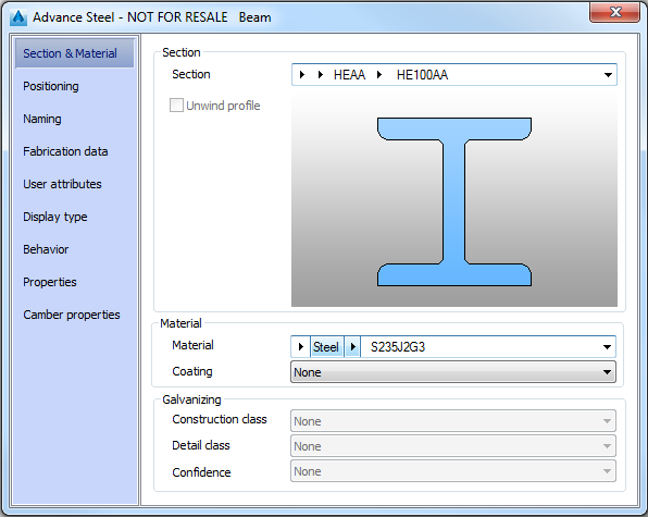 On this tab of the beam properties dialog box, you can select the beam section type and size and the material.