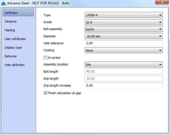 | Assembly location | Selects the bolt assembly location (site, site drill, shop). |