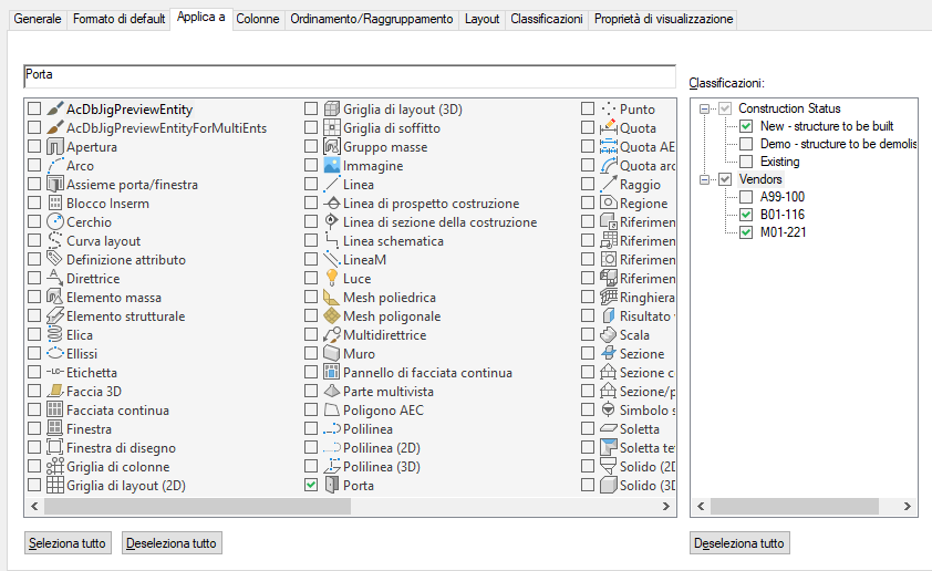 Per specificare i criteri di classificazione che un oggetto deve soddisfare al fine di essere incluso nei computi creati dallo stile di tabella di computo selezionato, attenersi alla procedura indicata di seguito. È possibile specificare più di una classificazione per ciascun tipo di oggetto.