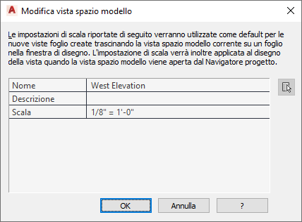Nota: Per modificare il nome, la descrizione o il fattore di scala di una vista dello spazio modello, non è necessario aprire il disegno della vista associata. Per modificare i contorni dello spazio modello, è invece necessario aprire il disegno della vista associata.