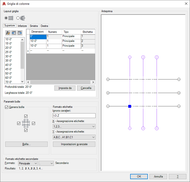 - È possibile modificare manualmente le etichette di una griglia di colonne personalizzata avanzata e modificare i parametri di assegnazione automatica delle etichette (primaria e secondaria). Quando si modifica questa griglia di colonne personalizzata avanzata modificata manualmente mediante la finestra di dialogo Griglia di colonne, vengono conservate le seguenti caratteristiche: