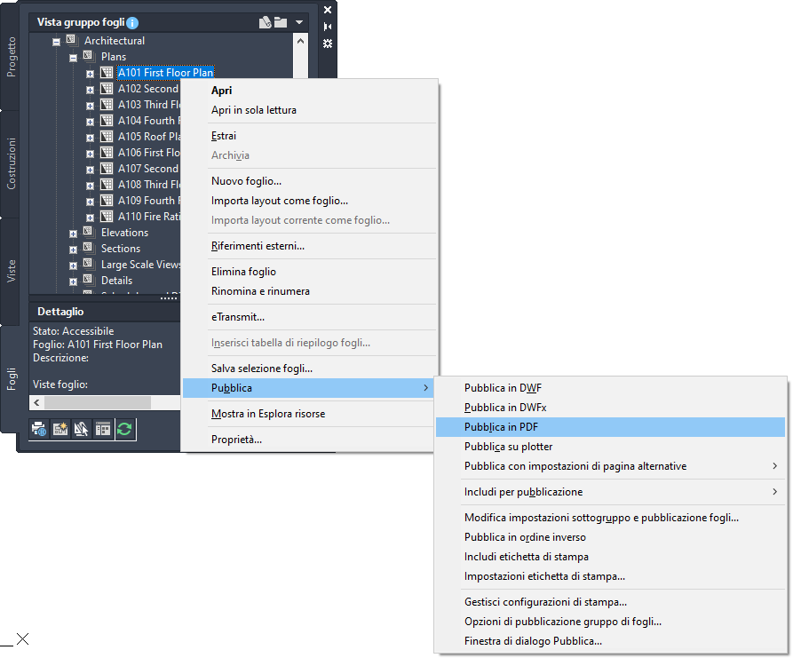 Nella Vista gruppo fogli è possibile pubblicare i fogli su un plotter, in un file PDF, DWF o DWFx. È possibile assegnare etichette di stampa al gruppo di fogli, pubblicare i fogli in un'impostazione di pagina alternativa e specificare le impostazioni di pubblicazione su PDF, DWF e DWFx.