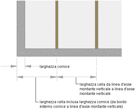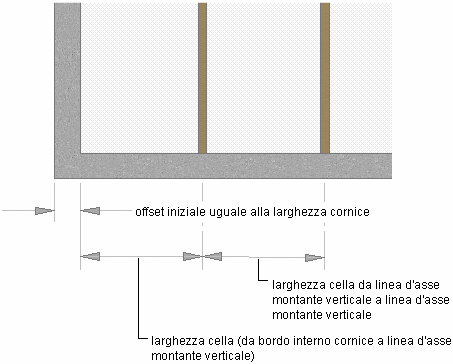 Per default, le celle delle griglie vengono misurate dal punto iniziale al punto finale della linea di base dell'assieme porta/finestra nel caso di divisioni orizzontali, o dalla linea di base all'altezza di base nel caso di divisioni verticali. La larghezza dell'infisso della griglia non viene considerata nel calcolo della dimensione della cella. Ad esempio, se si disegna un assieme porta/finestra con una linea di base pari a 4,27 m e un infisso di 30,48 cm a sinistra e a destra e si specifica un numero fisso di celle verticali, le celle non avranno le stesse dimensioni. La prima e l'ultima cella risulteranno più piccole perché includono anche l'infisso.