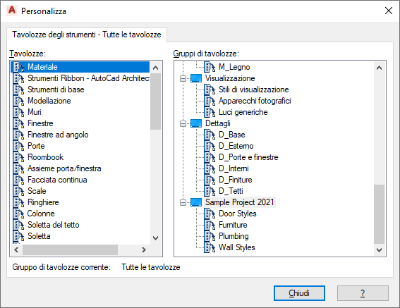 A sinistra vengono elencate tutte le tavolozze disponibili, a destra tutti i gruppi delle tavolozze. Il gruppo vuoto di tavolozze degli strumenti di progetto viene elencato qui.
