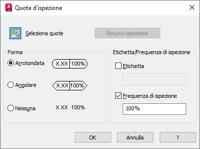 Utilizzare le impostazioni relative all'etichetta/frequenza di Forma e Ispezione per l'aspetto della cornice della quota d'ispezione e il valore relativo alla frequenza d'ispezione.