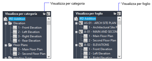 - Le categorie vista sono spesso associate ad una funzione. È ad esempio possibile utilizzare rispettivamente le categorie vista Prospetti in architettura e Viste esplose in progettazione meccanica. È possibile visualizzare le viste in base alla categoria oppure al foglio su cui si trovano. Le categorie possono essere nidificate in altre categorie in base alle necessità. Per spostare una vista in una categoria diversa, trascinarla nella struttura oppure utilizzare l'opzione del menu di scelta rapida Imposta categoria.