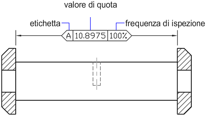 È possibile aggiungere una quota di ispezione a qualsiasi tipo di oggetto di quota. Una quota di ispezione è costituita da una cornice e da valori di testo. La cornice di una quota di ispezione è costituita da due linee parallele con l'estremità arrotondata o squadrata. I valori di testo sono separati da linee verticali. Una quota di ispezione può contenere fino a tre diversi campi dati di informazioni, ovvero l'etichetta di ispezione, il valore di quota e la frequenza di ispezione.