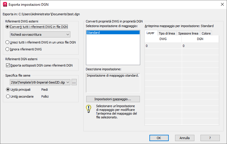 Elenca tutte le proprietà sia del file DWG esportato nella colonna DWG che dell'impostazione di mappaggio selezionata nella colonna DGN.