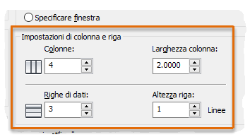 - Nella finestra di dialogo Inserisci tabella, immettere 4 colonne e 3 righe di dati. Specificare una posizione per la tabella.