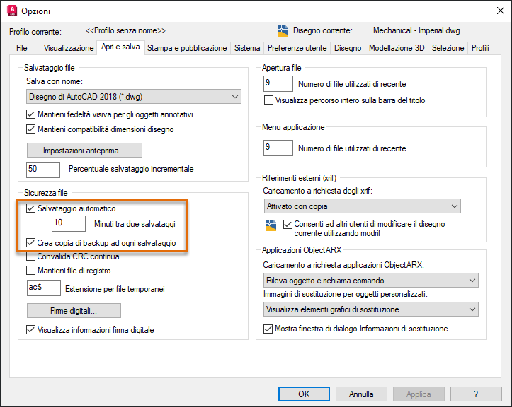 Backup e salvataggio automatico dei file di disegno