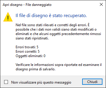 Se il disegno aperto contiene errori, il numero di errori rilevati e corretti viene visualizzato insieme al numero di oggetti cancellati perché non è stato possibile correggerli.