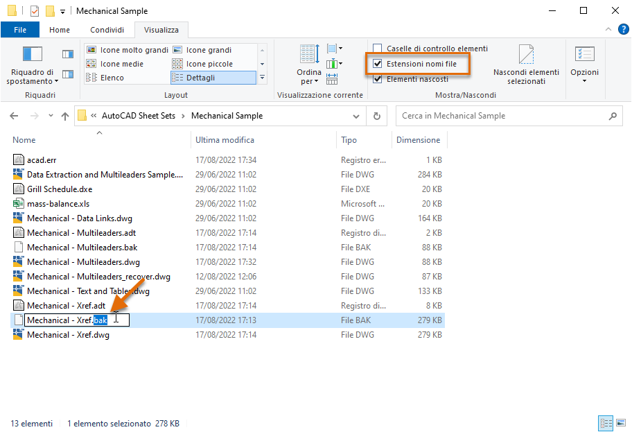 Nota: I file di disegno di backup (BAK) e di salvataggio automatico (SV$) non possono essere aperti direttamente in AutoCAD. Prima di poterli aprire, è necessario modificare l'estensione del file da BAK o SV$ a DWG.