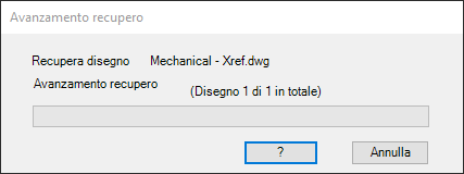 Viene visualizzata la finestra di messaggio Avanzamento recupero, che informa l'utente dell'avanzamento della verifica per i file xrif attaccati al disegno.