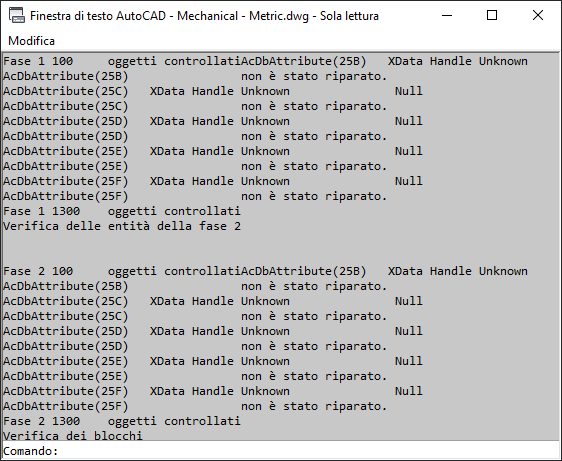 Se si desidera visualizzare il rapporto di riepilogo dettagliato della verifica, premere CTRL+F2 per aprire la finestra di testo di AutoCAD o premere F2 per espandere la finestra Riga di comando.