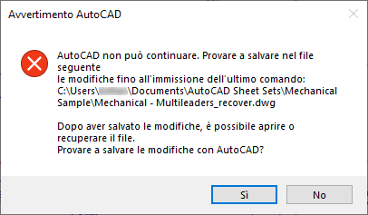 Sebbene speriamo che non si presenti mai, potrebbe verificarsi un momento in cui AutoCAD riporta un problema e si arresta in maniera imprevista. In tal caso, viene richiesto di salvare ogni disegno aperto contenente modifiche non salvate. A questi disegni verrà aggiunto il suffisso "_recover" ai rispettivi nomi per garantire che il file di disegno salvato in precedenza non venga sovrascritto.