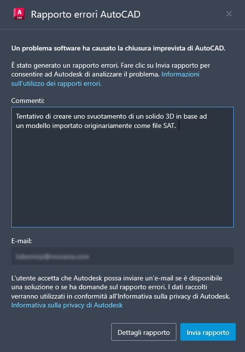 Dopo il salvataggio di eventuali disegni aperti con modifiche non salvate, dovrebbe essere visualizzata la finestra di dialogo Rapporto errori di AutoCAD. Da questa finestra di dialogo è possibile inviare un rapporto errori. Il rapporto errori include informazioni sullo stato corrente del programma e della workstation e può includere informazioni facoltative, ad esempio le operazioni eseguite al momento dell'errore. I rapporti errori vengono utilizzati per migliorare la stabilità del prodotto.