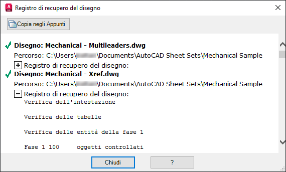 Nella finestra di messaggio Registro di recupero del disegno, esaminare il rapporto di riepilogo della verifica del disegno e dei relativi xrif attaccati. Fare clic su Chiudi per chiudere la finestra di messaggio.