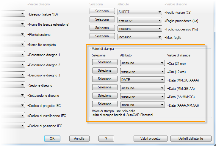 Durante l'impostazione del cartiglio è possibile associare un formato di data e ora di stampa ad un attributo specifico. Questo attributo viene aggiornato automaticamente quando si stampa il disegno.