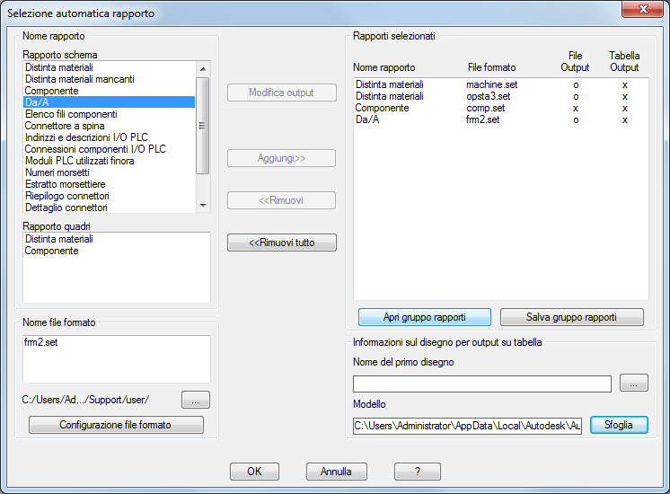 selezionare le opzioni specifiche per il rapporto, quindi selezionare i disegni da elaborare. Alla fine viene visualizzato il rapporto.
