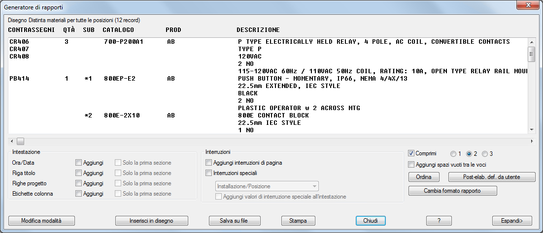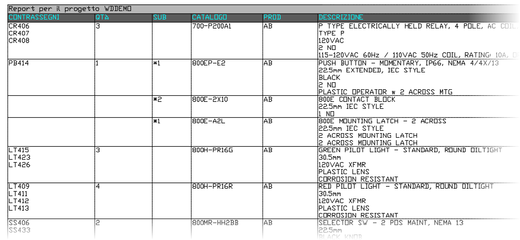 In Set di strumenti AutoCAD Electrical è possibile scegliere fra una serie di rapporti. Alcuni rapporti contengono informazioni estratte solo dai disegni dello schema, mentre altri contengono informazioni estratte solo dai disegni di layout del quadro. È anche possibile creare un rapporto completo della distinta dei materiali, contenente tutti gli elementi del quadro e gli elementi dello schema non visualizzati nei layout del quadro.