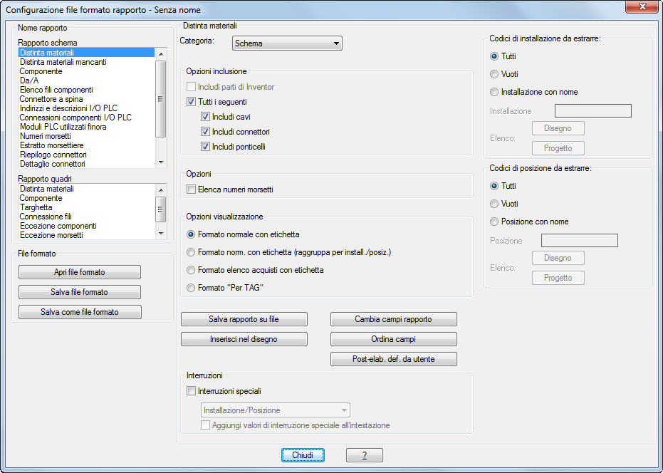 Utilizzare questa finestra di dialogo per preimpostare le opzioni del rapporto e le impostazioni per i campi, per la tabella del rapporto, per il file di output e altro. Le opzioni del rapporto possono essere diverse a seconda del tipo di rapporto selezionato.