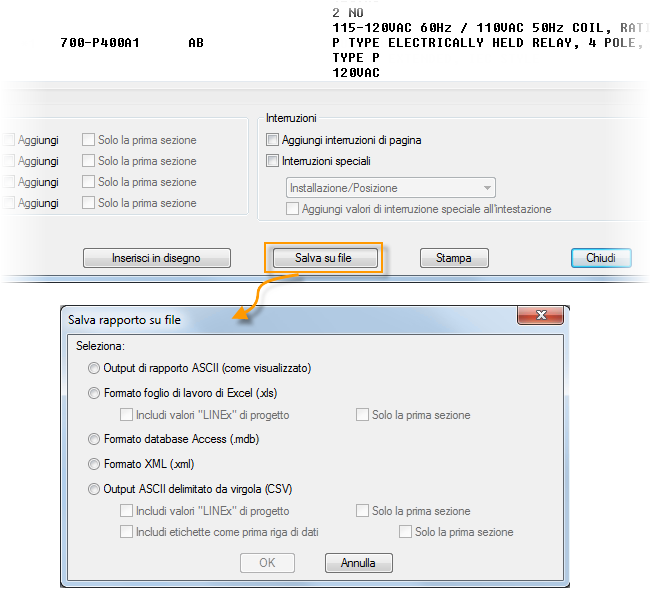 Generare e formattare i rapporti. È possibile eseguire l'output di un rapporto in un file o inserirlo come oggetto tabella nel disegno.