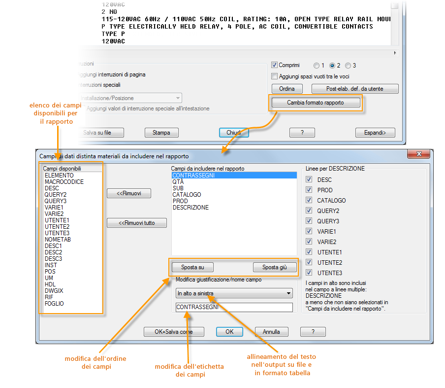 Una volta eseguito il rapporto è possibile includere ed escludere i campi, nonché modificare l'ordine e l'etichetta dei campi.