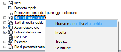 1. Nella scheda Personalizza, nel riquadro Personalizzazioni in <nome file>, fare clic con il pulsante destro del mouse sul nodo Menu di scelta rapida e scegliere Nuovo menu di scelta rapida.