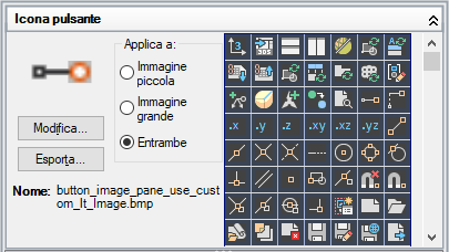 Nel riquadro Icona pulsante, in Applica a, selezionare una delle tre opzioni di assegnazione dell'immagine: Immagine piccola, Immagine grande o Entrambe. Quindi selezionare l'icona da importare dall'elenco di immagini.