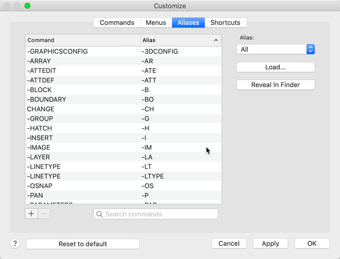 Nota: Le modifiche agli alias dei comandi vengono salvate nel file acaduser.pgp (o acadltuser.pgp per AutoCAD LT).