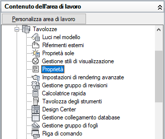 Nel riquadro Contenuto dell'area di lavoro, fare clic sul segno più (+) accanto al nodo Tavolozze per espanderlo.