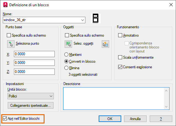 Se il blocco non è aperto nell'Editor blocchi, fare doppio clic sulla finestra stirabile creata in precedenza e fare clic su OK per modificare il blocco.