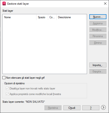 Deselezionare Disattiva layer non trovati nello stato layer. Quando ripristiniamo lo stato layer, ciò non influirà sui layer che non erano presenti nel disegno in cui è stato creato lo stato layer.