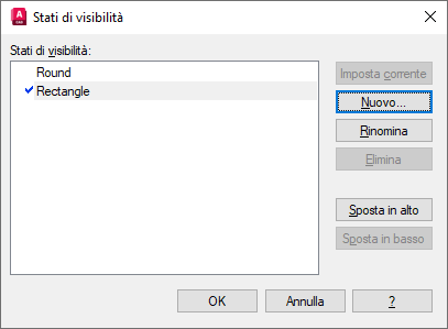 A questo punto si è pronti per definire la parte dinamica di questo blocco. In questo esempio, è necessario definire 2 stati di visibilità. Uno stato di visibilità definisce quale geometria è visibile quando tale stato è selezionato. Diventerà tutto più chiaro quando si prova la procedura alla fine.