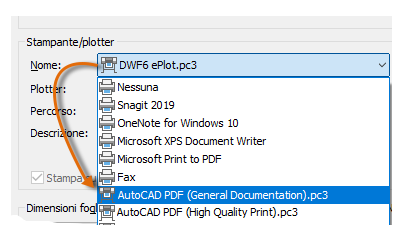 Dall'elenco a discesa Stampante/plotter, scegliere AutoCAD PDF (Generale documentation).pc3: