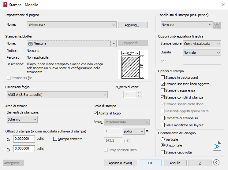 Ad ogni scheda di layout nel disegno può essere associata un'impostazione di pagina. Questa opzione è utile se si utilizzano più dispositivi o più formati di output o se sono definiti diversi layout con varie dimensioni di foglio nello stesso disegno.