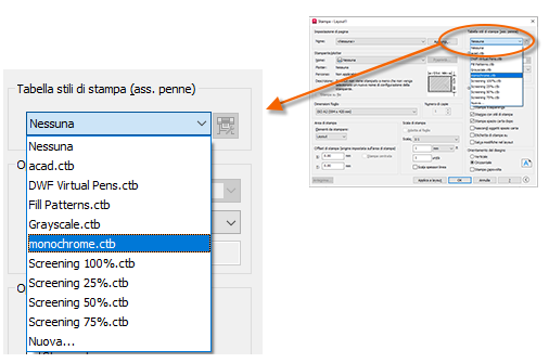 Nella tabella stili di stampa vengono fornite informazioni sull'elaborazione dei colori. I colori visualizzati correttamente sul monitor possono non essere adatti ad un file PDF o alla stampa. Ad esempio, può essere necessario creare un disegno a colori, ma generare un output monocromatico. Di seguito è riportata la procedura per specificare un output monocromatico: