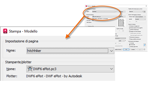 Quando si decide di eseguire la stampa, è sufficiente specificare il nome dell'impostazione di pagina nella finestra di dialogo Stampa per ripristinare tutte le impostazioni di stampa. Nella figura che segue, la finestra di dialogo Stampa è configurata per l'utilizzo dell'impostazione di pagina Hitchhiker, in base alla quale verrà generato un file DWF (Design Web Format) in alternativa alla stampa su plotter.