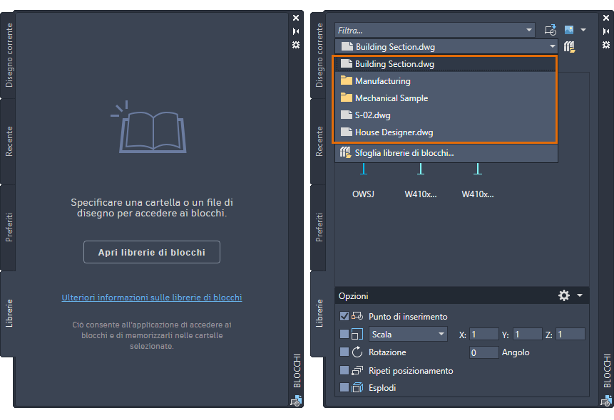 La scheda Altri disegni della tavolozza Blocchi è stata rinominata Librerie. È ora possibile specificare una cartella, un file di disegno o qualsiasi definizione di blocco memorizzata in un disegno da inserire come blocco nel disegno corrente. La scheda Librerie include un elenco a discesa che visualizza le 5 librerie di blocchi (cartella o file di disegno) utilizzate più di recente per un accesso più rapido. Se si sceglie una libreria di blocchi in una posizione di memorizzazione nel cloud, è possibile utilizzare gli stessi blocchi nell'app AutoCAD per il Web.