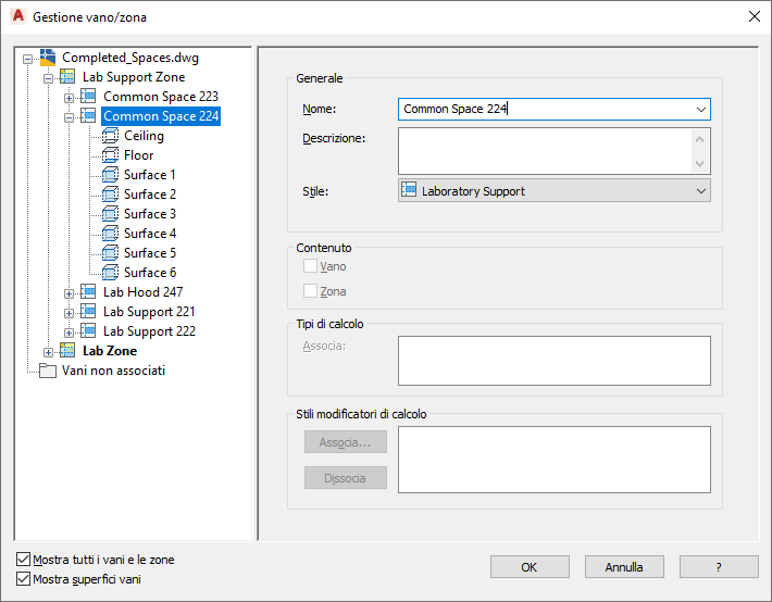 È possibile espandere le zone per visualizzare i vani associati ad esse. Espandendo i vani sarà possibile visualizzare le superfici, i tipi di superficie e le aperture.
