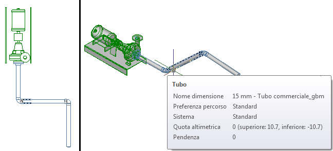 L'esempio seguente illustra la visualizzazione di tubature in pendenza nella vista piana e nella vista SO assonometrico.