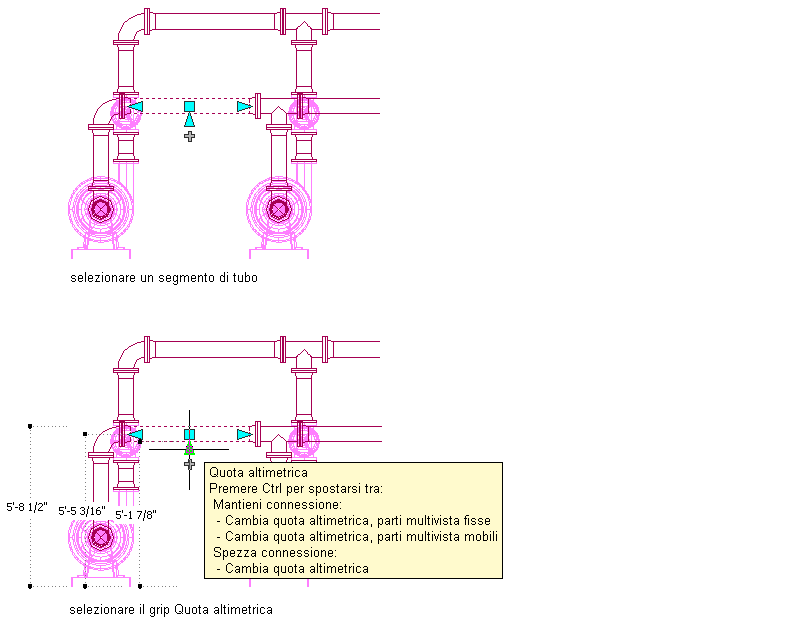 Per parti o segmenti di tubo connessi ad altri oggetti, è possibile specificare se si desidera mantenere la connettività quando si modifica la quota altimetrica dell'oggetto tubo.