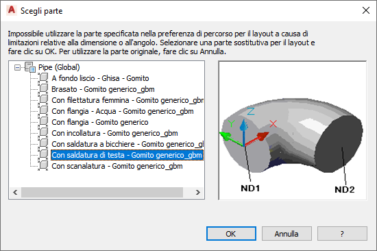 La finestra di dialogo Scegli parte viene visualizzata se si tenta di aggiungere o modificare una parte in un tratto non memorizzato nelle preferenze. Verrà richiesto di effettuare una sostituzione dal catalogo. Nel seguente esempio viene mostrata la finestra nel dominio Tubature nel profilo ad unità inglesi o metriche: