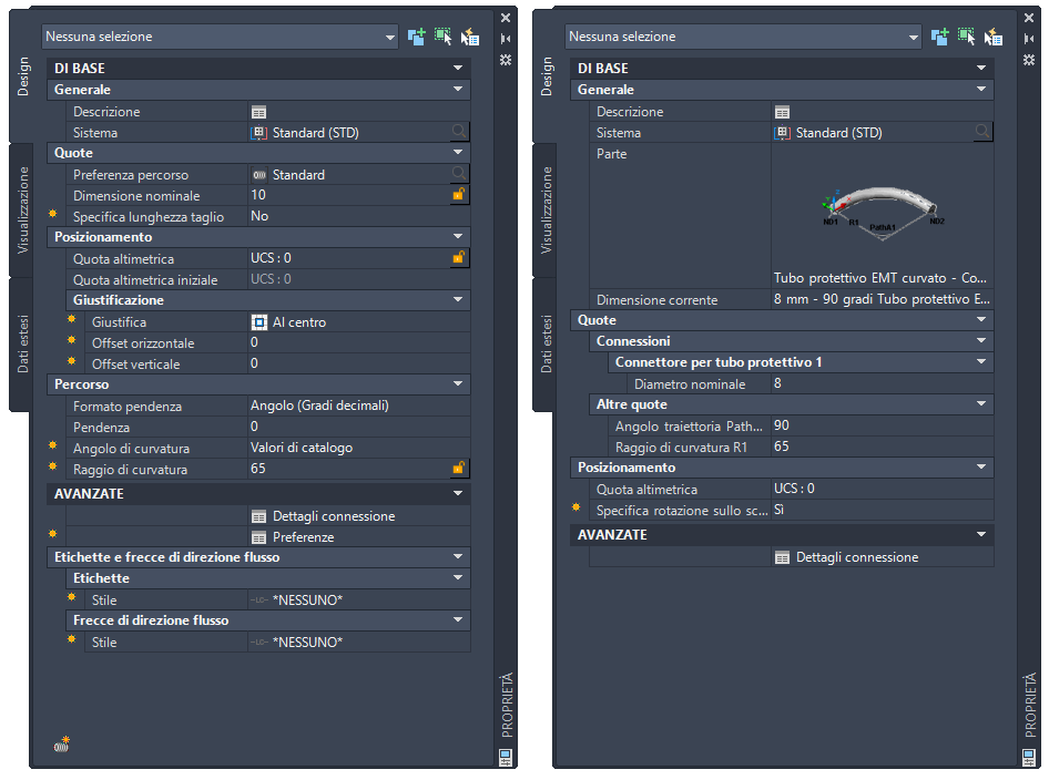 .Per specificare le impostazioni di tubi protettivi e raccordi, è possibile utilizzare il riquadro proprietà per i tubi protettivi.