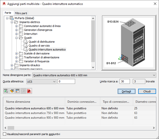 - Fare clic su Dettagli per visualizzare le dimensioni disponibili per il sottotipo parte selezionato.