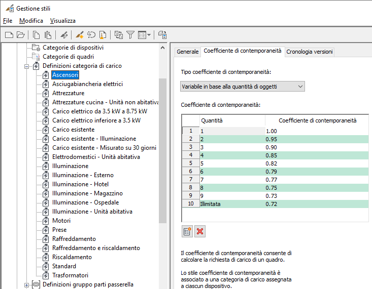 Se invece si imposta un coefficiente di contemporaneità variabile in base alla quantità degli oggetti, ad esempio nel caso degli ascensori, il valore minimo del coefficiente di contemporaneità sarebbe pari al 72%, ossia a 0,72. Si ottiene quindi un carico stimato di 600 VA x 0,72 (unità di coefficiente di contemporaneità) = 432 VA.