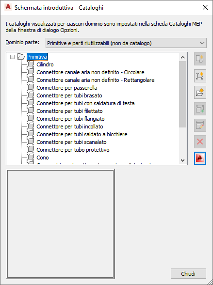 2. Nella finestra di dialogo Schermata introduttiva - Cataloghi, in Dominio parte selezionare Primitive e parti riutilizzabili.