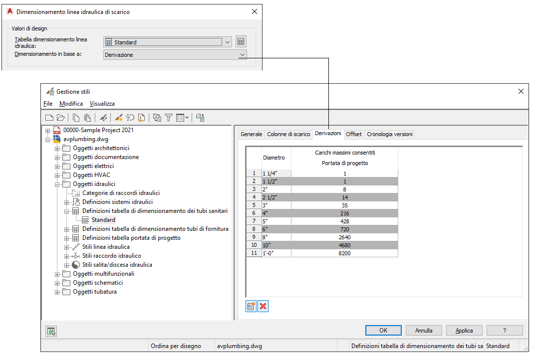 Quando si definisce il tratto di linea di scarico come derivazione, i calcoli di dimensionamento vengono eseguiti in base ai dati della scheda Derivazioni della tabella di dimensionamento della linea idraulica di scarico (tabella di dimensionamento tubo), le cui definizioni si trovano in Gestione stili.
