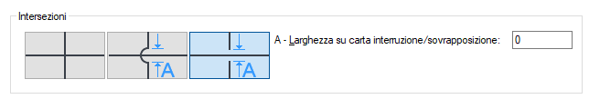 | Misto (uno su Sovrapposizione, l'altro su Interruzione) | Uguali | Lo stile di intersezione viene determinato in base alla seconda linea disegnata. Se lo stile è impostato su Sovrapposizione, la sovrapposizione viene visualizzata sulla seconda linea disegnata. Se lo stile è Interruzione, l'interruzione viene visualizzata sulla prima linea disegnata. |