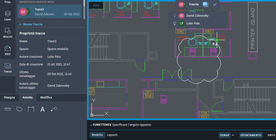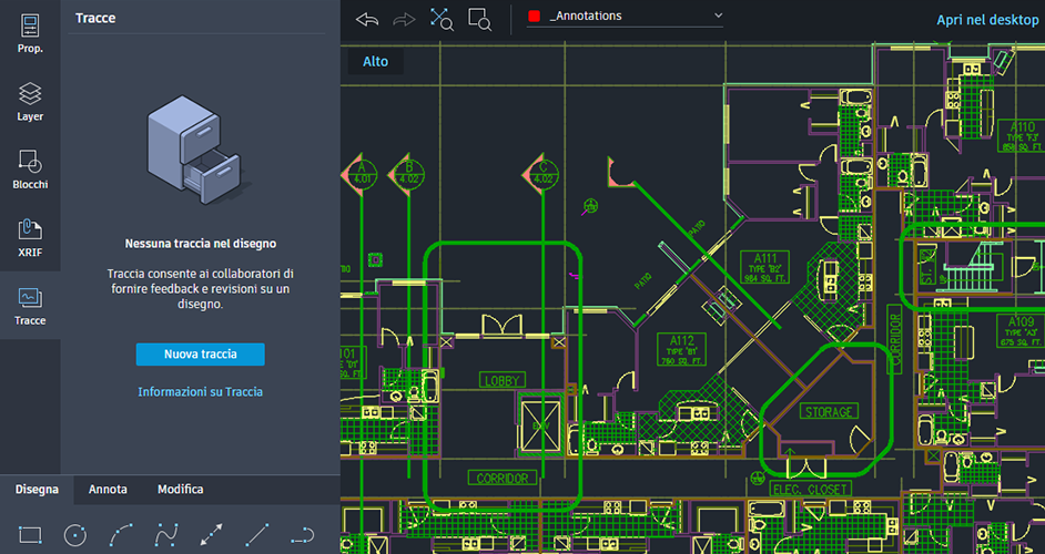 Traccia fornisce uno spazio sicuro per fornire feedback su un disegno senza modificare il disegno esistente. L'analogia è rappresentata da una carta da lucidi collaborativa virtuale posizionata sul disegno che consente ai collaboratori di aggiungere revisioni e commenti sul disegno.